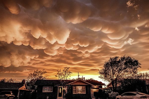 Mammatus comes from the Latin word “mamma” which translates to “udder” or “breast”. Their striking appearance is most visible when the sun is low in the sky and their pouches are framed by the sunlight.