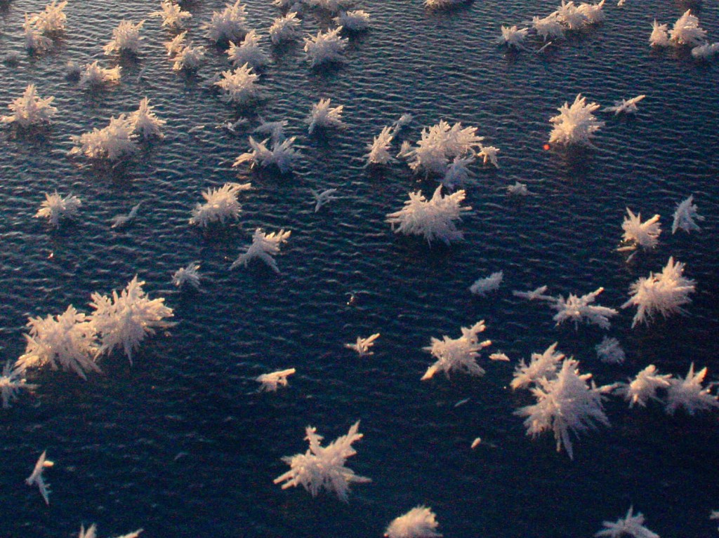 These are ice crystals that appear on the ocean or lake’s surface when the air is frigid, and actually not a rare sight in the arctic ocean! It is very similar to frost that forms in any cold environment, and they tend to last up to 2 weeks as long as the winds and waters are calm. For these to form, the air must be dry and cold – colder than the surface of the water. We are talking -22 degrees Celsius. As the ice directly turns from ice into vapor, and if this vapor becomes oversaturated with liquid, as soon as it touches an ice crystal, the flowers begin to form.